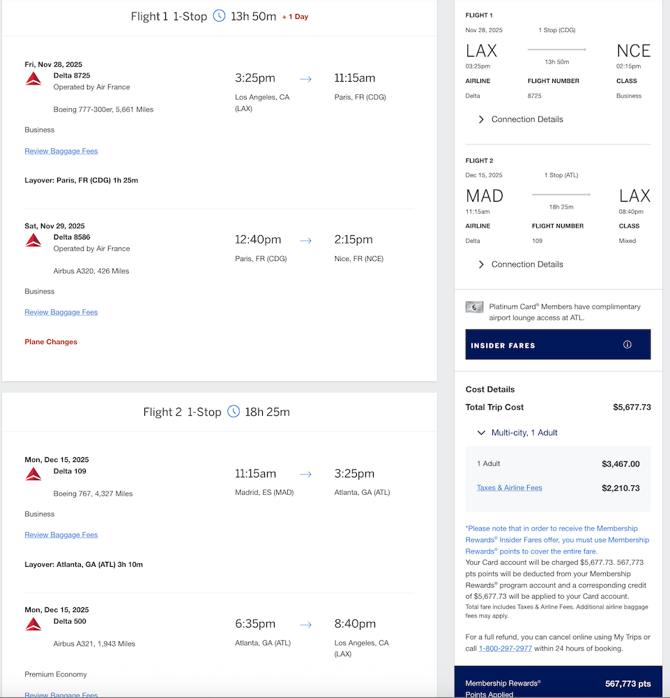 I needed an open-jaw business-class ticket: Los Angeles to Nice, France, then Madrid back to Los Angeles. Traditional airline mileage programs offered exorbitant redemption rates – over 400,000 miles each way with Delta, and over 536,500 with Air France-KLM, plus hefty taxes and fees. It seemed an impossible task.